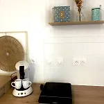 The apartment provides a fully-equipped kitchen with all necessary utensils to prepare meals.
